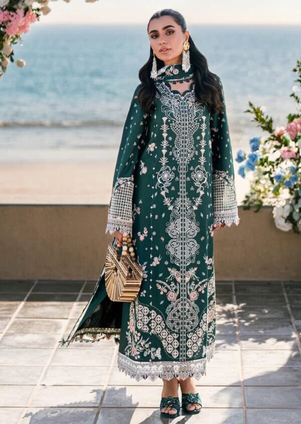 Rang Rasiya’s 2024 Luxury Lawn: Embroidered sciffle front, sequin organza dupatta, cambric trouser.