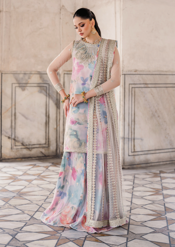Elegant digital printed lawn suit with heavy embroidered details and premium net dupatta