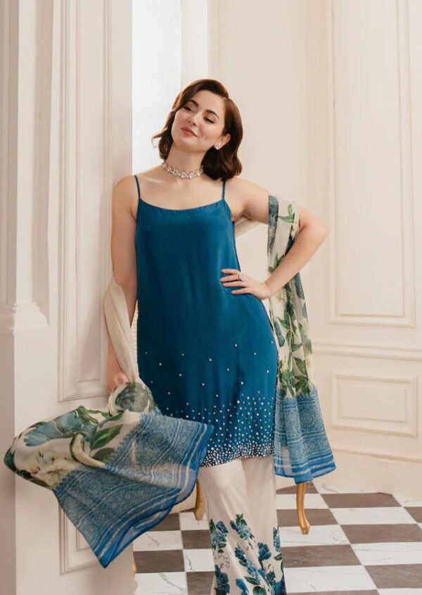 Lulusar’s Most Demanding Edition: Blue unstitched Sharmooz Silk suit with exquisite handwork and digital prints