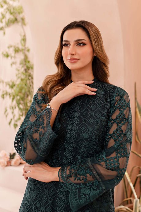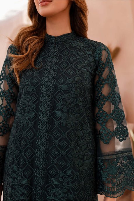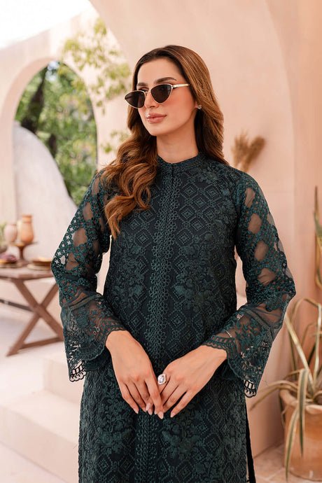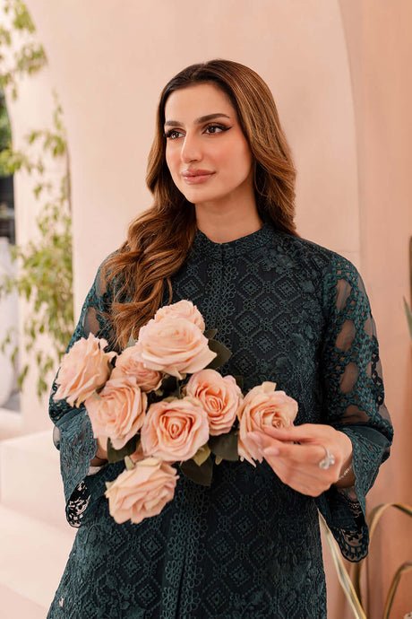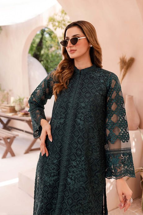 This elegant unstitched suit is crafted from luxurious soft organza, designed to create a graceful and sophisticated look. The shirt features a thread and sequence embroidered front, with a detailed front daman that includes a two-piece border. The sleeves are also beautifully adorned with thread and sequence embroidery, while the back is a soft, solid color. A separate thread embroidered center lace is included for a refined finish. The ensemble is completed with a thread and sequence embroidered organza dupatta and a solid-colored dyed trouser for a balanced and comfortable fit.
