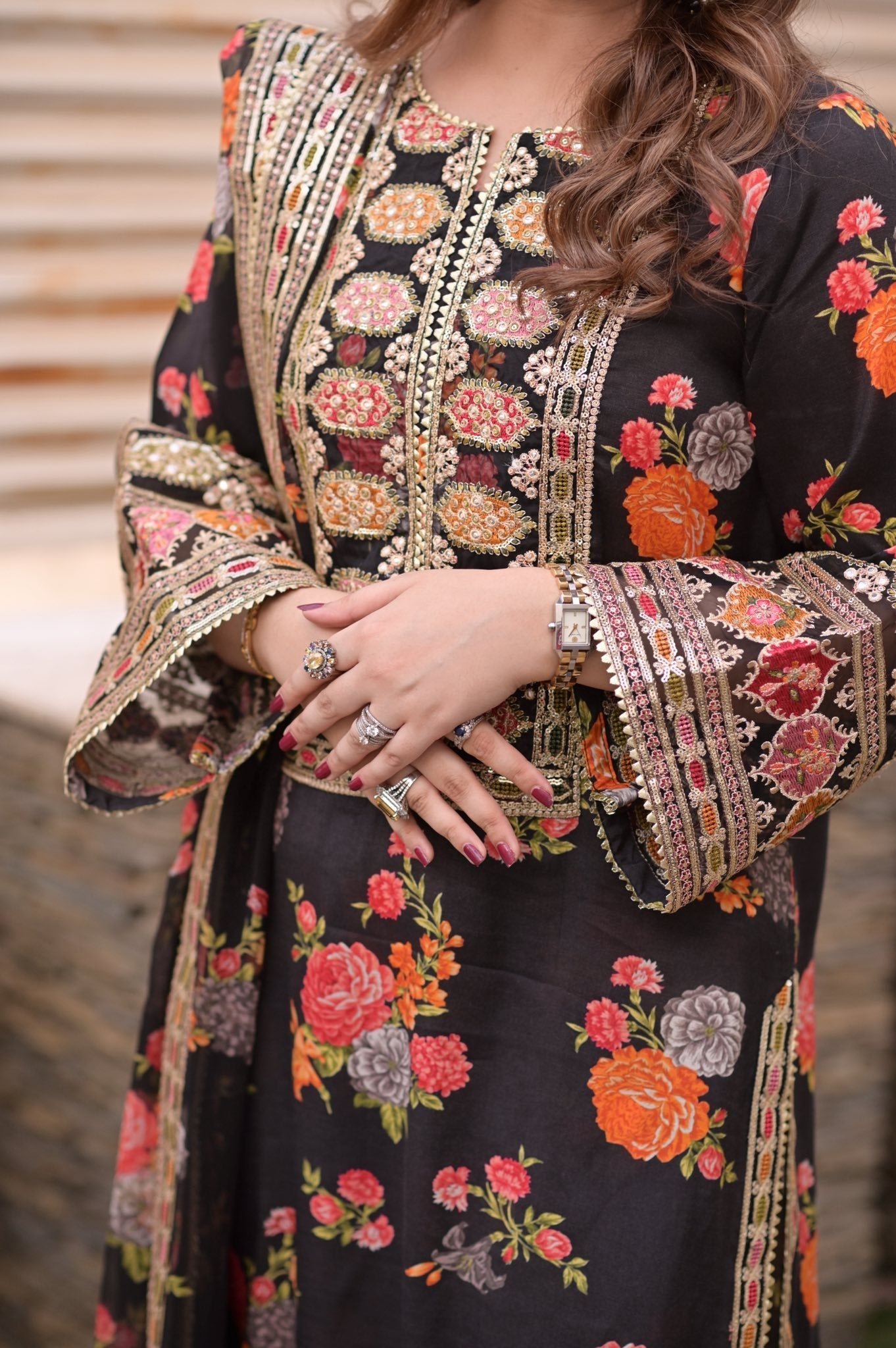 Introducing a stunning 3-piece unstitched suit designed with luxury and elegance. The outfit features a digitally printed Shamoz silk shirt, dupatta, and trouser complemented by heavy embroidery on the neck, borders, and sleeves. The dupatta is beautifully adorned with 4-sided cutwork embroidery, offering a rich and graceful look for any festive or formal occasion.