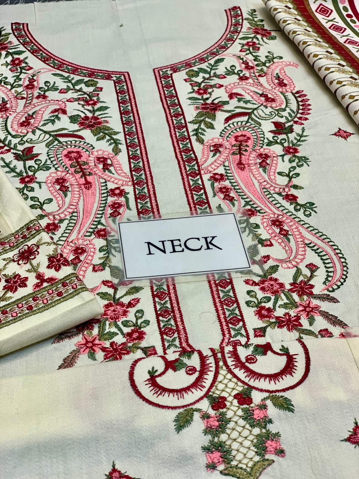 The back and trouser are kept plain dhanak, providing a clean and classic balance to the heavily worked front.
