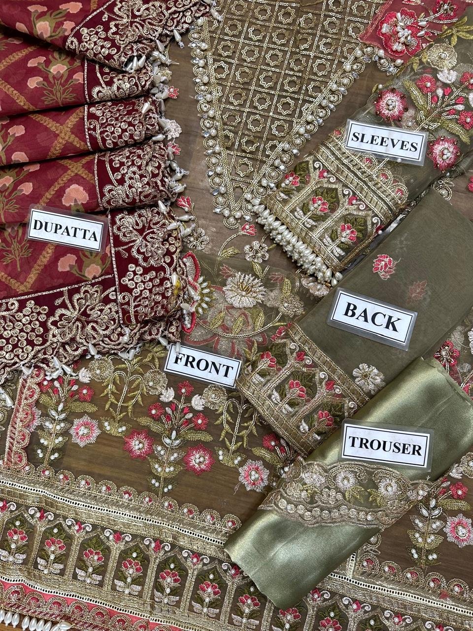 Experience luxury with the Crimson Unstitched Replica, exquisitely designed on premium organza fabric paired with a satin silk trouser. The front is richly embroidered with sequence, stone, and pulse work, giving a festive and royal appeal.